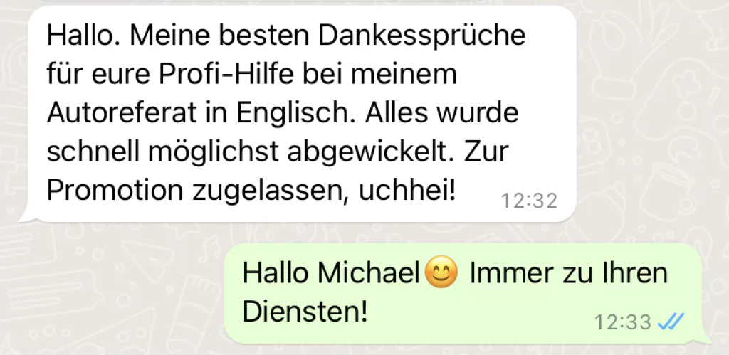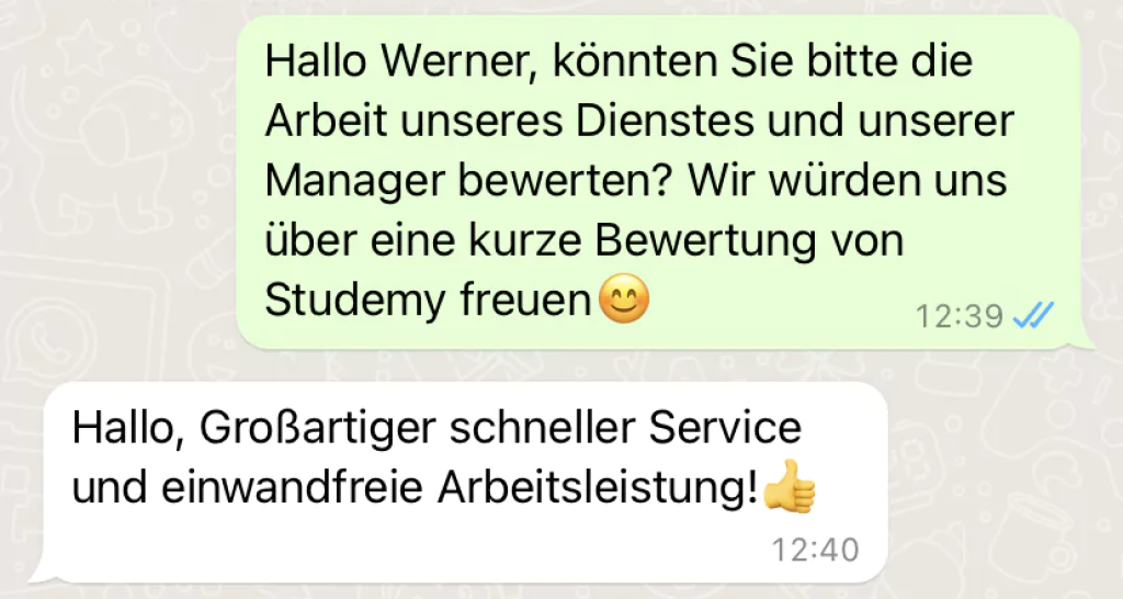 Die Arbeit meines Managers hat einen hohen professionellen Standard! Dank ihm habe ich schnell einen Autor für meine Kursarbeit gefunden. Ich habe ihn auch nicht im Stich gelassen! Sehr zufrieden!